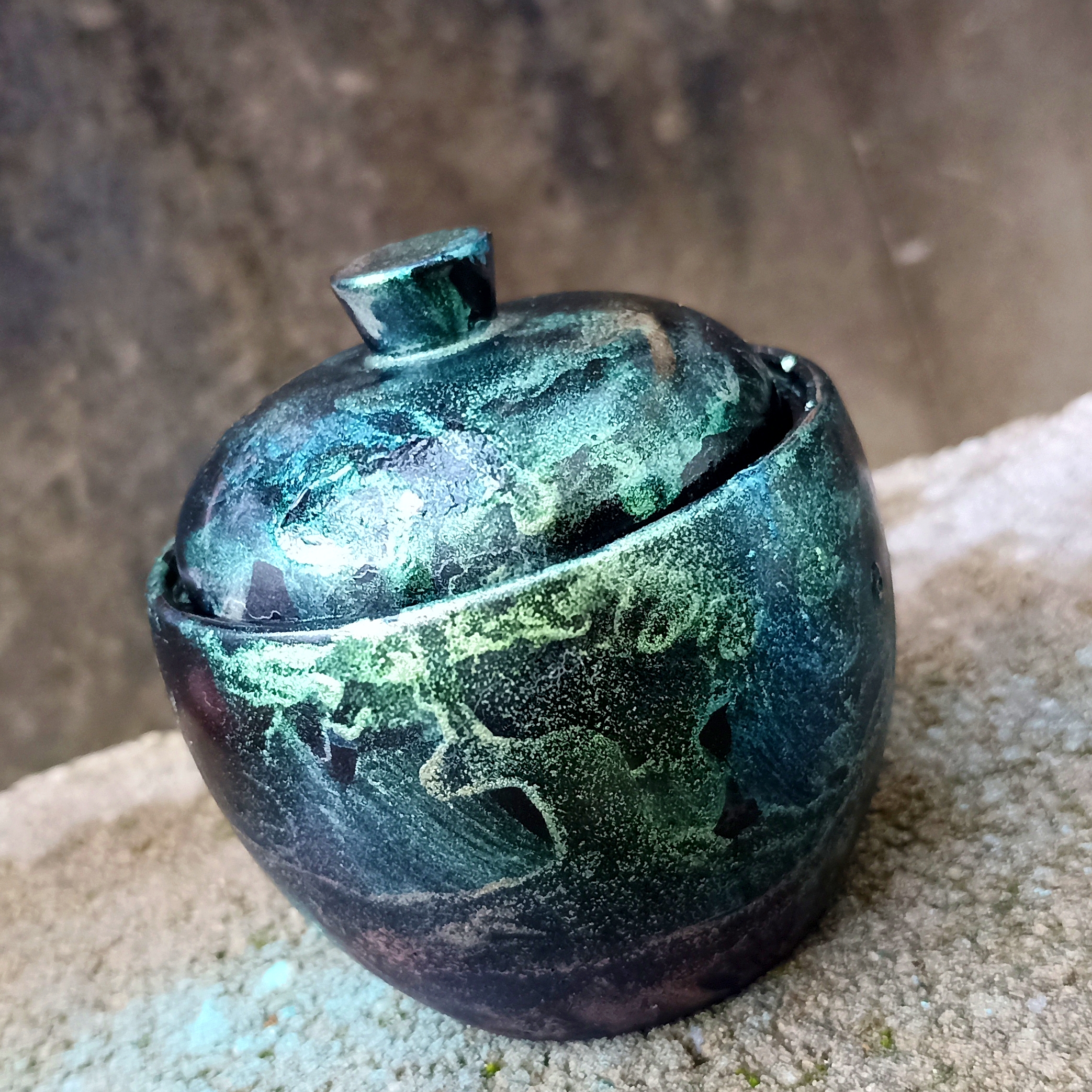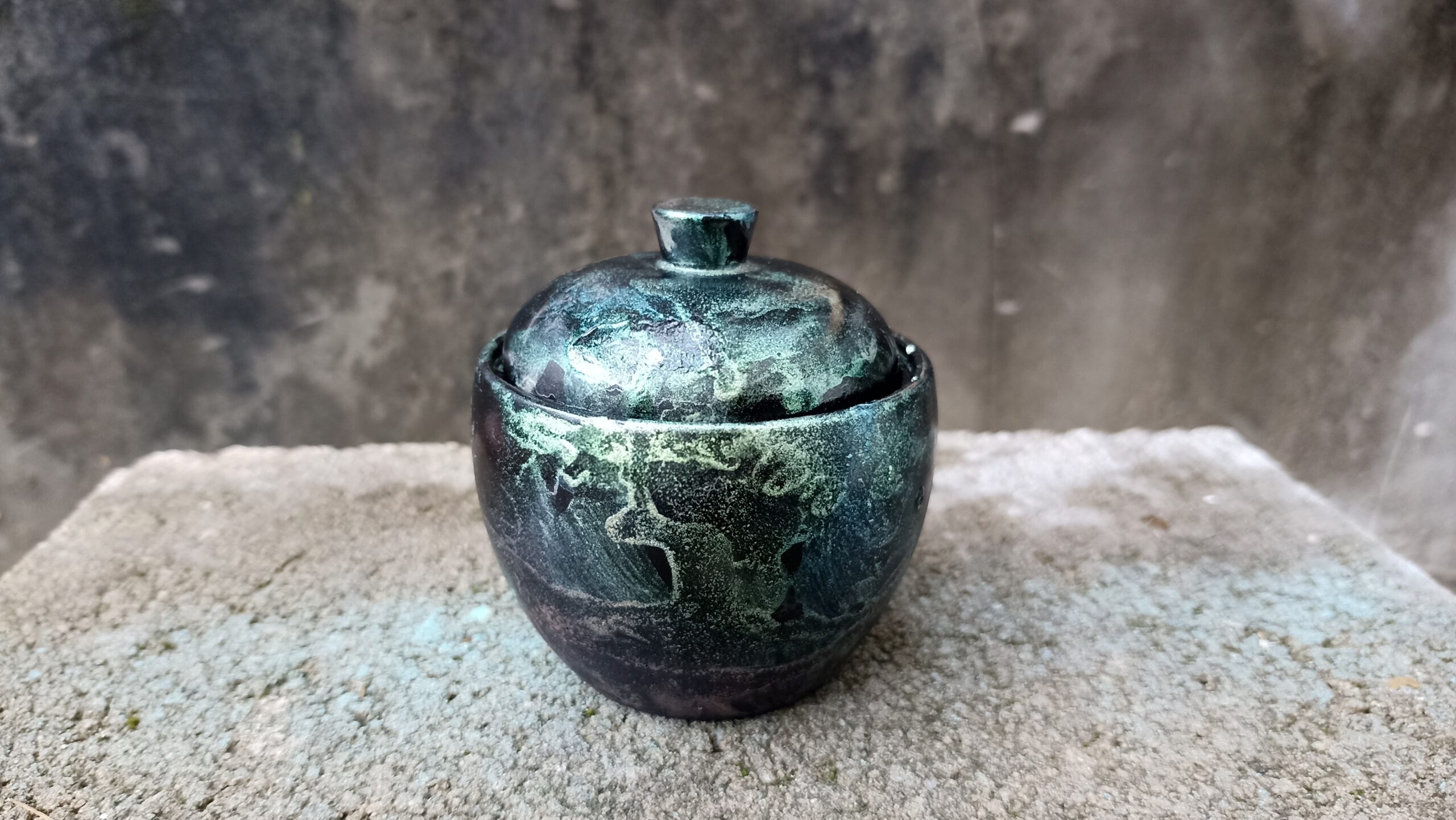 Extra erős, karcmentes, vízálló, kerámia porból készült kis edény, fedővel. Chameleon art pigmentekkel színezve. 8×10 cm.