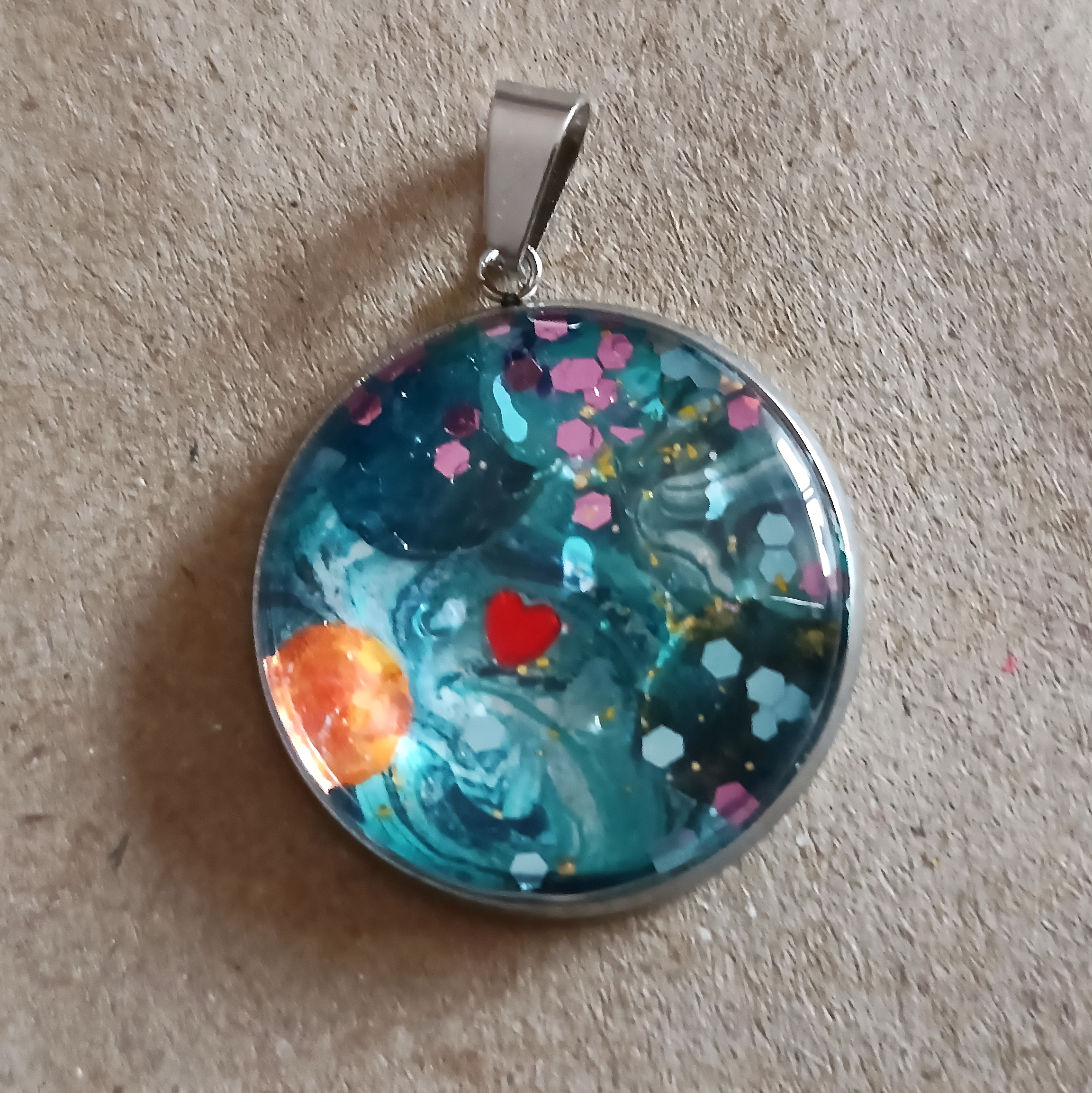 Fluid Art technikával készült, nemesacél, üveg, akril, csillámpor. 2,5 cm.