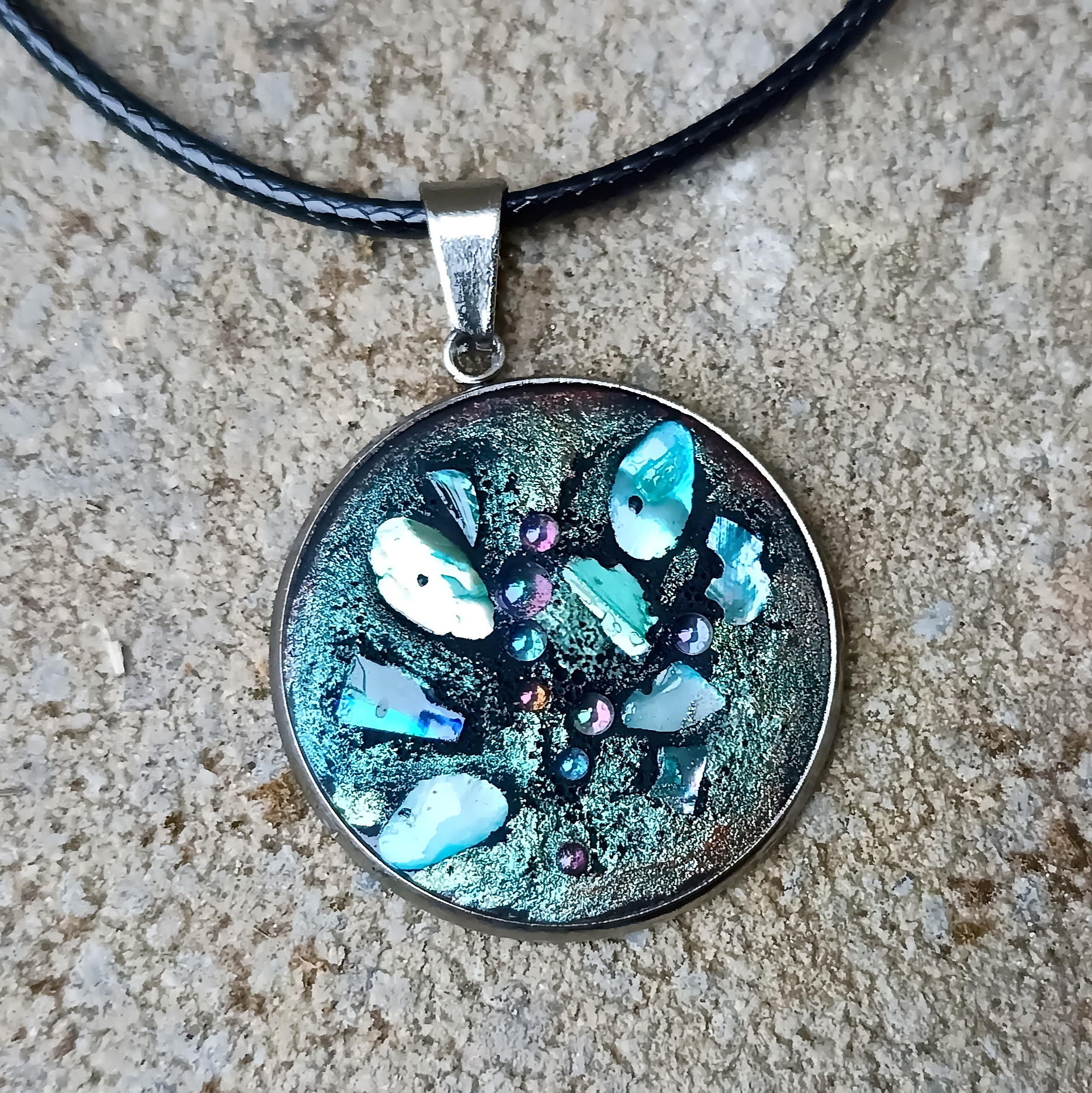 Fekete kerámia porból készült, ásványi kövekkel díszített nemesacél ékszer. 2,5 cm.